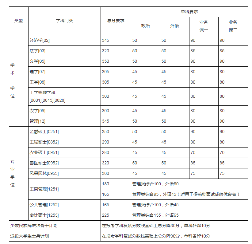 說明:1、上表為我?;緩?fù)試分?jǐn)?shù)要求,生源充裕學(xué)院可根據(jù)整體考試情況、招生計劃、學(xué)科專業(yè)特點等,上調(diào)分?jǐn)?shù)要求,但差額復(fù)試比例不得低于120%。報考該類學(xué)院的考生須達到學(xué)院公布的復(fù)試分?jǐn)?shù)要求才能參加復(fù)試。學(xué)院調(diào)整后的復(fù)試分?jǐn)?shù)線、復(fù)試辦法,由各院近日公布,請考生密切留意。