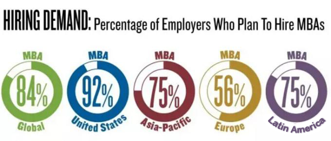 調(diào)查顯示,2015年雇主對商學(xué)院畢業(yè)生的需求繼續(xù)呈現(xiàn)強(qiáng)勁的上升趨勢,全球有84%的企業(yè)計(jì)劃招聘MBA畢業(yè)生,而這一比例在2014年為74%,五年前僅為62%。同時,全球各地區(qū)對MBA畢業(yè)生的需求也有較大差異。