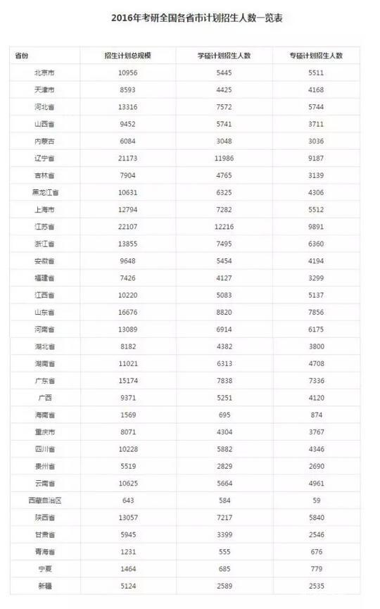 附: 2016年考研全國各省市計劃招生人數(shù)一覽表