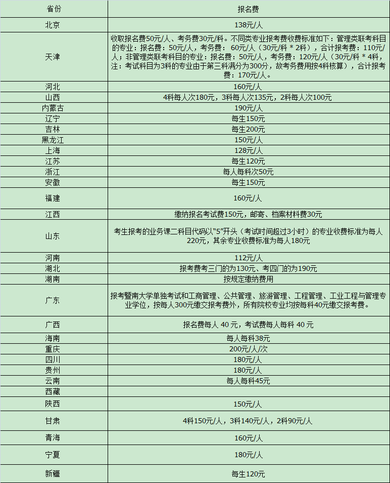 2020年全國各省市考研報(bào)名費(fèi)