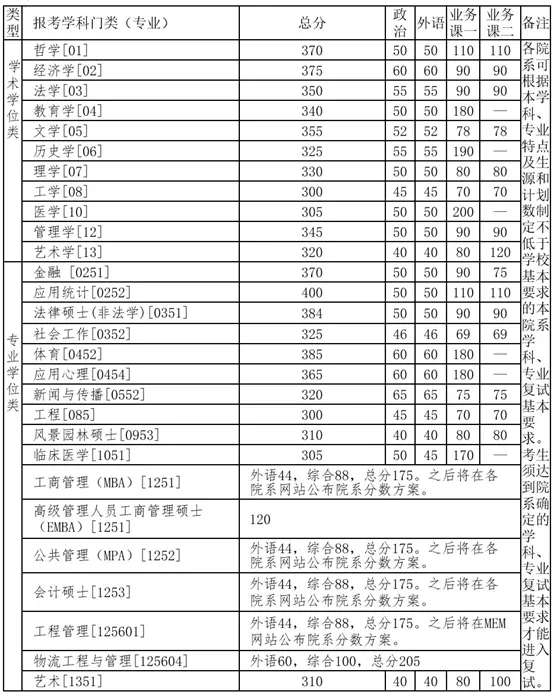 (2)“少數(shù)民族高層次骨干人才計(jì)劃”(不含新疆MPA項(xiàng)目):同時(shí)滿足滿分100分科目單科成績不低于40分;滿分150分科目單科成績不低于70分;滿分200分科目單科成績不低于107分;滿分300分科目單科成績不低于140分;總分滿分300分考生總分不低于195分;總分滿分500分考生中,理工醫(yī)考生(報(bào)考專業(yè)代碼前兩位為“07”、“08”或“10”)要求總分不低于270分,非理工醫(yī)考生總分不低于320分?;蛘咭罁?jù)所報(bào)考院系(專業(yè))復(fù)試分?jǐn)?shù)線,總分線降10分,單科線不降。兩項(xiàng)分?jǐn)?shù)政策不可同時(shí)享受。