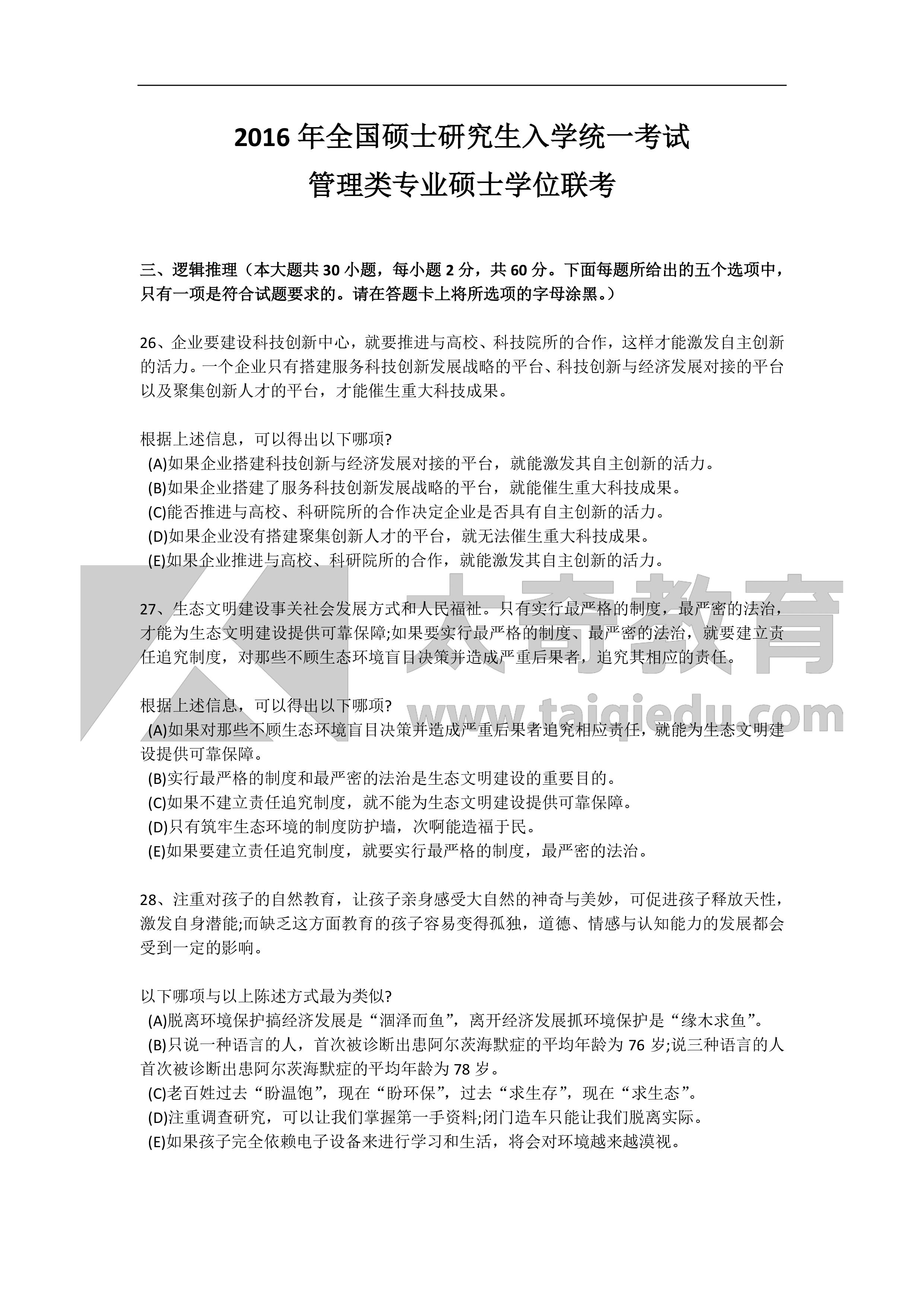 2016MBA管理類聯(lián)考邏輯真題