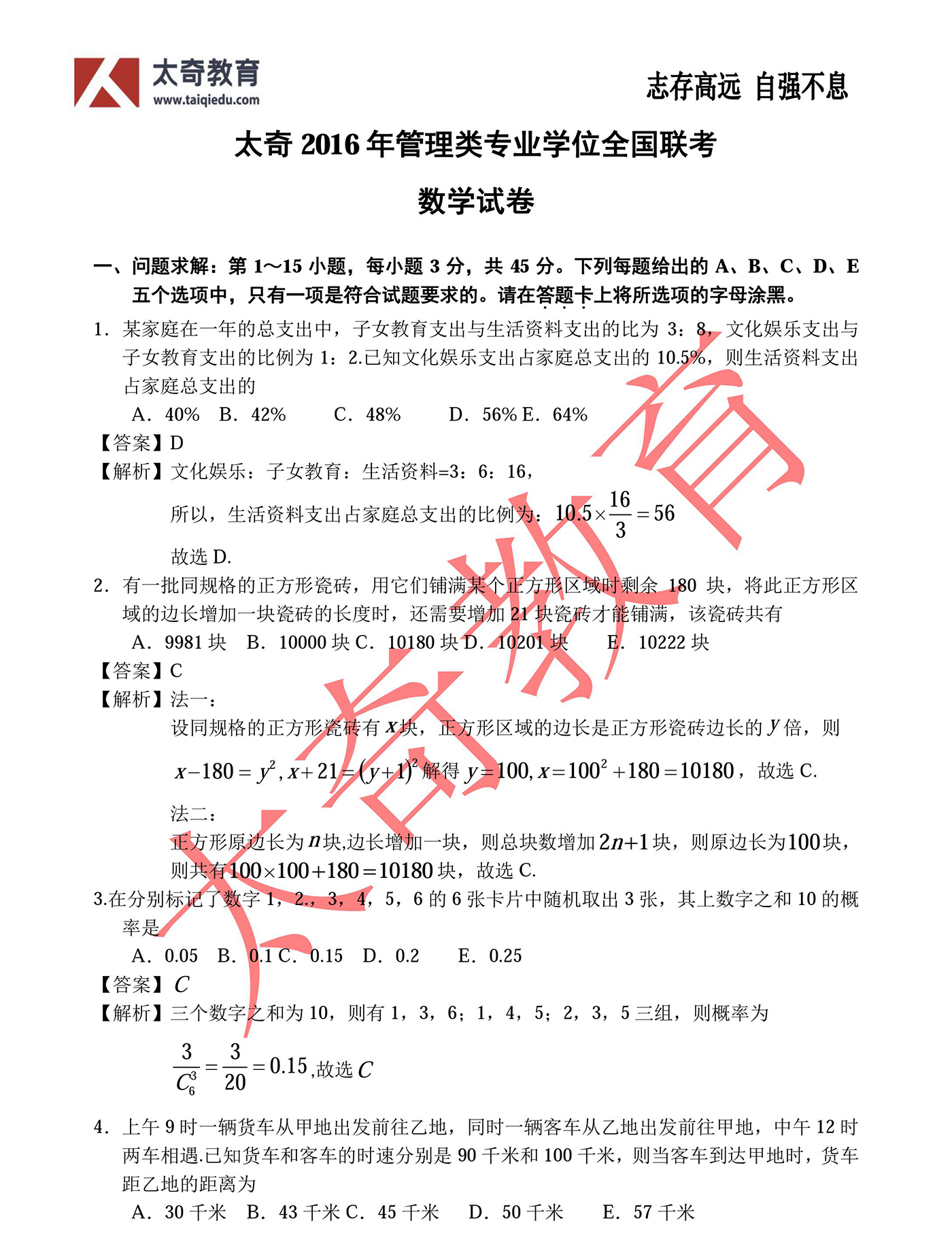 2016管理類聯(lián)考數(shù)學真題完整解析(太奇官方版)