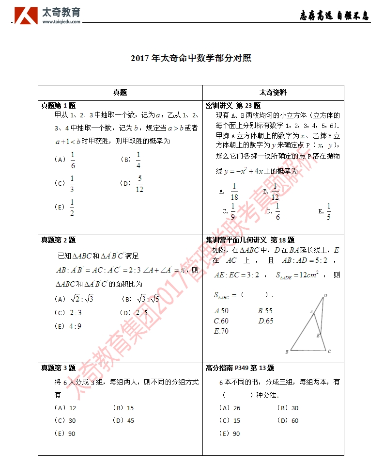 祝賀太奇教育2017管理類(lèi)聯(lián)考數(shù)學(xué)直接命中66分