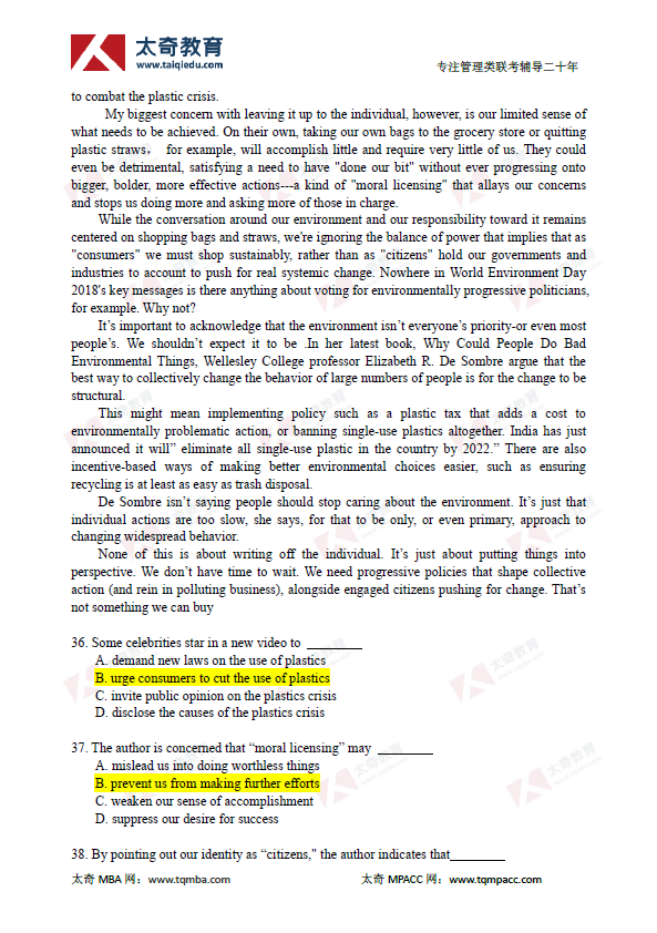 2019年管理類聯(lián)考MBA英語二真題及參考答案(7)