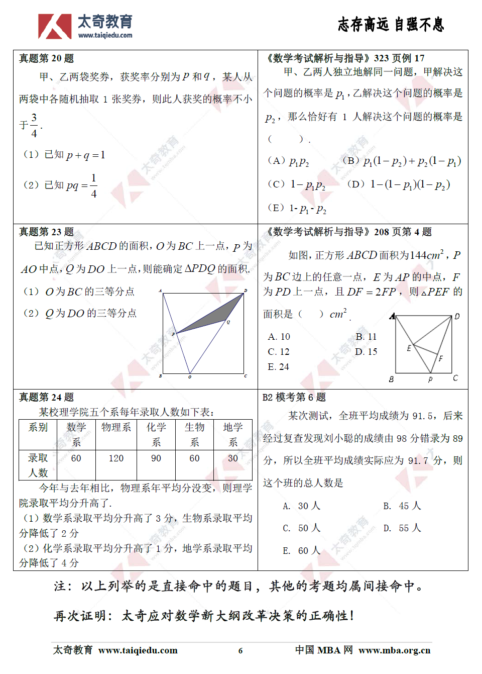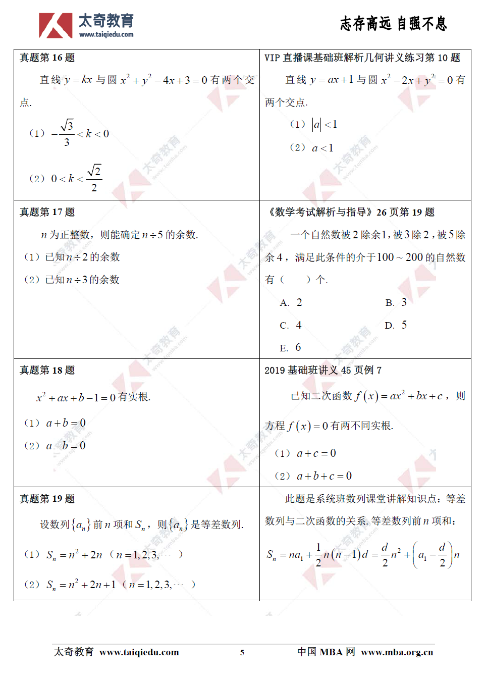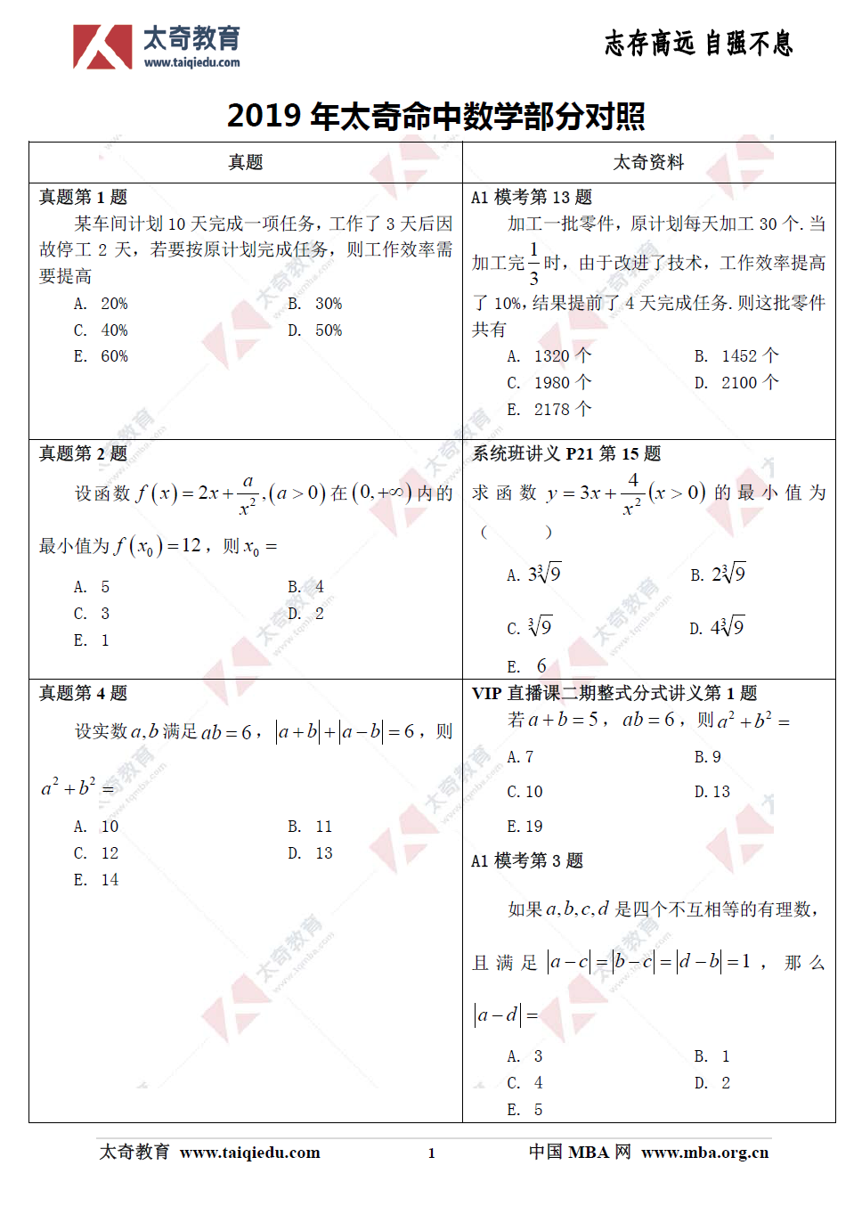在2019年管理類聯(lián)考中,綜合數(shù)學考試部分直接命中57分,其他考題均屬間接命中,附《太奇2019年管理類聯(lián)考數(shù)學真題命中對照》!再次證明:太奇應對數(shù)學新大綱改革決策的正確性!比命中考題更為重要的是:太奇在對每次??嫉闹R點、考點,尤其在對命題方向的把握上極其精準。