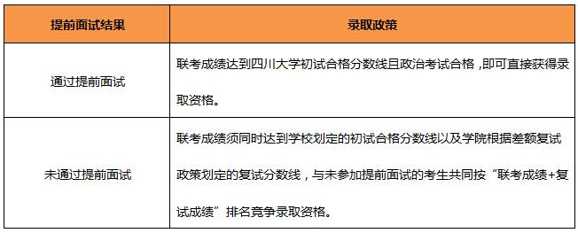 復(fù)試包括常規(guī)面試和政治考試,通過(guò)提前面試的考生參加政治考試合格則直接獲得錄取資格;未通過(guò)提前面試及未參加提前面試的考生參加政治考試合格后按照“聯(lián)考成績(jī)+面試成績(jī)”排名競(jìng)爭(zhēng)錄取資格。