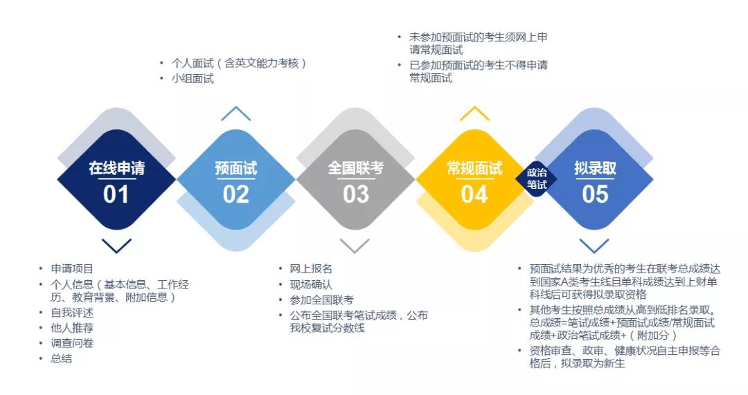 3)預(yù)面試一般。預(yù)面試獲得一般的考生無附加分。當(dāng)年聯(lián)考總成績達(dá)到國家A類線且單科成績達(dá)到上財(cái)單科線,按照總成績從高到低排名錄取。