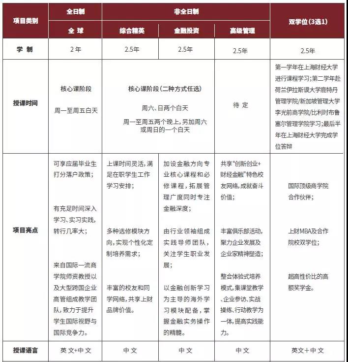 2020年上財(cái)MBA項(xiàng)目設(shè)有全日制-全球班、非全日制-綜合精英班、非全日制-金融投資班、非全日制-EMBA,各項(xiàng)目概況詳見下圖: