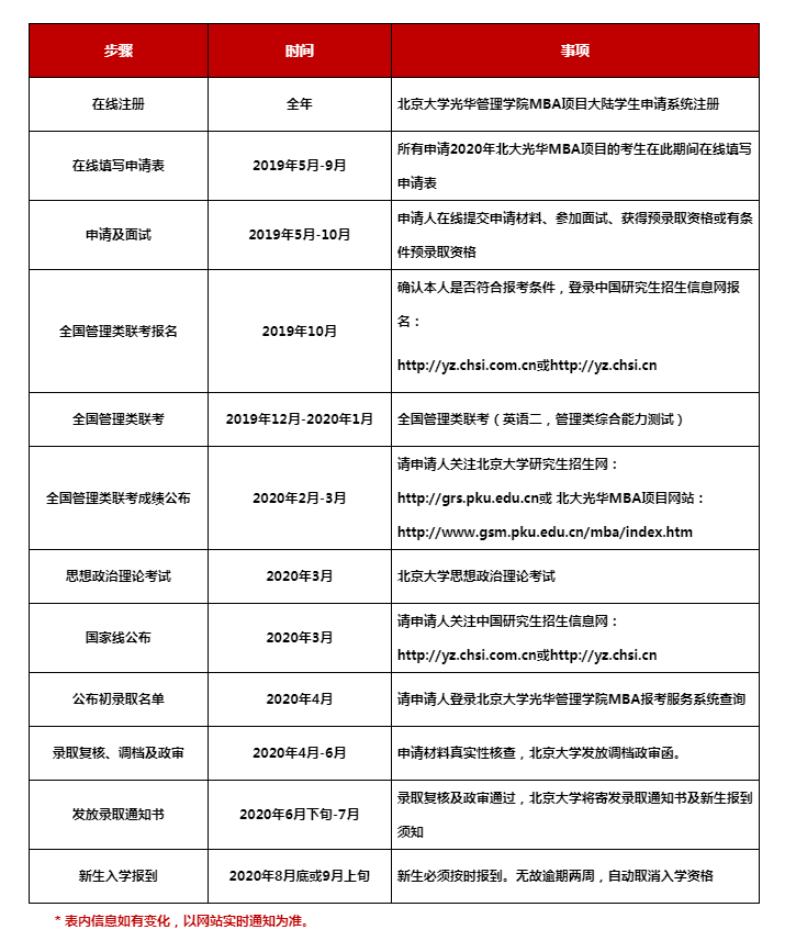 3. 獲得北京大學(xué)光華管理學(xué)院MBA預(yù)錄取資格的申請人,在報考北京大學(xué)并參加全國管理類聯(lián)考后,如聯(lián)考成績未達(dá)到國家A類線或北京大學(xué)思想政治理論考試成績不合格,可保留原項目預(yù)錄取資格至次年。