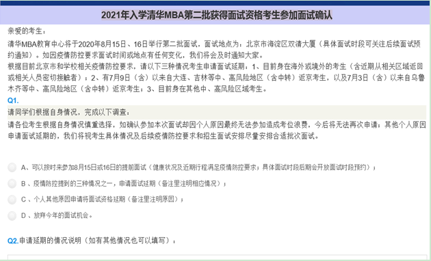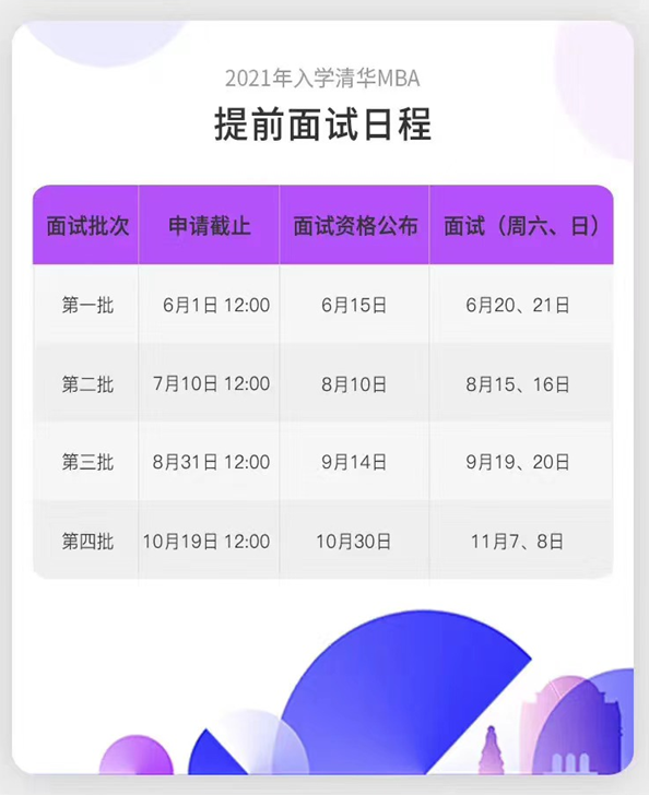 2021年清華MBA的日程安排(材料截止及面試時(shí)間)和往年相比差別不大,但第一批面試6月份的時(shí)候北京疫情形勢(shì)不太樂觀,所以面試時(shí)間都延后了,故第一批材料通過,需要面試的同學(xué)們都被迫在第二批面試時(shí)候選擇第二或者后三四批次來面試。