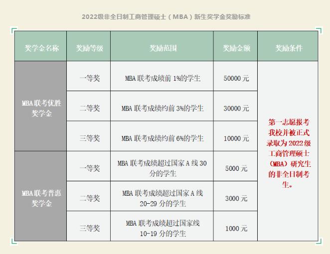 為了鼓勵優(yōu)秀人才攻讀非全日制工商管理碩士(MBA),培養(yǎng)更多品學(xué)兼優(yōu)的商界精英,北京交通大學(xué)MBA教育中心特設(shè)立MBA聯(lián)考優(yōu)勝獎學(xué)金、MBA聯(lián)考普惠獎學(xué)金。其獎勵范圍、獎金額度和獎勵對象如表三所示。若有變動,均以具體通知為準(zhǔn)。