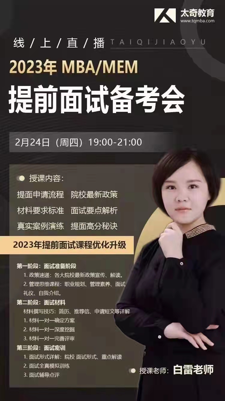 今天星期三,明天星期四,本周四的晚上19:00-21:00,白雷老師將線上直播《2023MBA/MEM提前面試備考會》