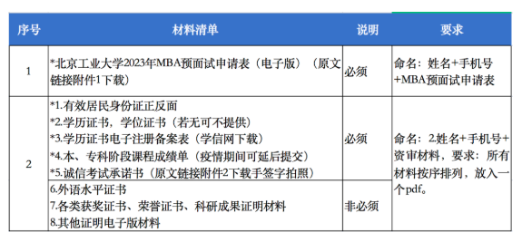 1.《北京工業(yè)大學(xué)2023年工商管理專業(yè)碩士MBA預(yù)面試申請(qǐng)表》(見(jiàn)原文鏈接附件1,提取碼:7jeb)。《北京工業(yè)大學(xué)2023年碩士研究生招生考試誠(chéng)信考試承諾書(shū)》(見(jiàn)原文鏈接附件2,提取碼:7jeb)承諾書(shū)需要打印后親筆簽字后拍照。