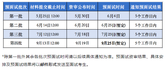 *除第一批外其余各批次預(yù)面試時(shí)間請(qǐng)以后續(xù)具體通知為準(zhǔn)。預(yù)面試資審結(jié)果、具體安排及預(yù)面試結(jié)果將以郵件形式發(fā)送至面試考生。