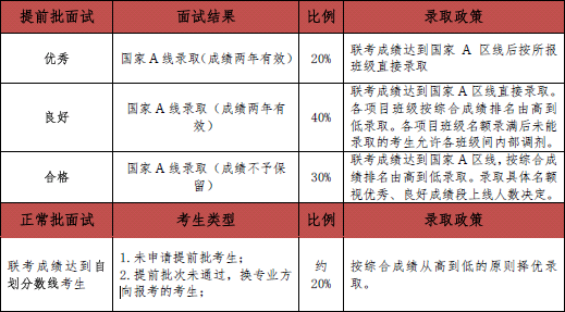 第一,繼續(xù)實行通過提前面試按“國家A線錄取”的招生政策,旨在選拔潛在的投資家、創(chuàng)業(yè)家和高級職業(yè)經(jīng)理人。提前面試分為優(yōu)秀、良好、合格三個等級。