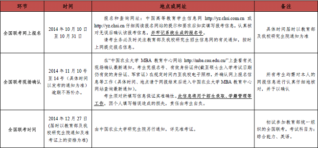 注意:報考我校MBA的考生必須選擇“中國農(nóng)業(yè)大學(xué)”為報考點,并于2014年10月10日至10月31日網(wǎng)上報名期間進行網(wǎng)上支付報名費,本考點不接收現(xiàn)場交費。