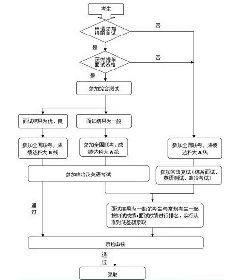 1.“提前面試”招生方式。采取“提前面試申請、背景評估、提前面試(綜合素質)、網上報名、現(xiàn)場確認、全國聯(lián)考、復試(政治理論考試和英語面試)、正式錄取”的方式進行。凡符合教育部規(guī)定的MBA報考條件的考生均可申請?zhí)崆芭嬖?,面試結果達到要求的考生享受相應的專項政策。