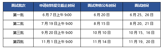 ②填寫和上傳申請(qǐng)材料。網(wǎng)上提交的申請(qǐng)材料包括:申請(qǐng)書、成績單、個(gè)人簡歷、單位組織結(jié)構(gòu)圖、推薦信(非必需)。申請(qǐng)材料的具體內(nèi)容和要求見系統(tǒng)內(nèi)說明。考生提交申請(qǐng)材料時(shí)需要選擇申請(qǐng)面試批次,并在所選批次申請(qǐng)材料提交截止日期前提交。各批次的申請(qǐng)截止時(shí)間和面試時(shí)間見下頁"面試批次"表。