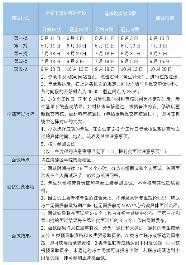 管理類碩士官方備考群,考生互動(dòng),擇校評(píng)估,真題討論 點(diǎn)擊加入備考群>>中央財(cái)經(jīng)大學(xué)MBA項(xiàng)目致力于培養(yǎng)具備全球視野和創(chuàng)新能力,擁有金融財(cái)務(wù)優(yōu)勢(shì),積極承擔(dān)社會(huì)責(zé)任的領(lǐng)導(dǎo)者。中央財(cái)經(jīng)大學(xué)MBA是國內(nèi)最具競(jìng)爭(zhēng)力和影響力的MBA項(xiàng)目之一,依托學(xué)校良好的社會(huì)聲譽(yù)和品牌價(jià)值,整合全校優(yōu)質(zhì)資源,注重發(fā)揮財(cái)經(jīng)學(xué)科特色和師資優(yōu)勢(shì),取得了豐碩的辦學(xué)成果和廣泛的社會(huì)認(rèn)可。2011年通過AMBA認(rèn)證,成為中國大陸地區(qū)第8家、北京地區(qū)首家AMBA認(rèn)證會(huì)員;2014年,通過AMBA再認(rèn)證,認(rèn)證有效期為5年;2017年,通過CAMEA認(rèn)證,認(rèn)證有效期為5年,并列第15位國內(nèi)高校通過認(rèn)證。同時(shí),中央財(cái)經(jīng)大學(xué)MBA項(xiàng)目多年多次被新華網(wǎng)、央廣網(wǎng)、騰訊網(wǎng)、新浪網(wǎng)、中國網(wǎng)、世界經(jīng)理人等媒體評(píng)為品牌影響力MBA院校、創(chuàng)新力MBA項(xiàng)目、品牌知名度MBA院校、表現(xiàn)最佳MBA院校、最受雇主青睞MBA項(xiàng)目和綜合實(shí)力突出商科教育品牌等榮譽(yù)稱號(hào)。為選拔更多優(yōu)質(zhì)生源,同時(shí)也為考生增加自主選擇的機(jī)會(huì),我校擬在2019年仍然采取提前批面試和正常批面試相結(jié)合的原則,并且不提前設(shè)定提前批面試和正常批面試人數(shù)分布的固定比例。具體細(xì)則如下: