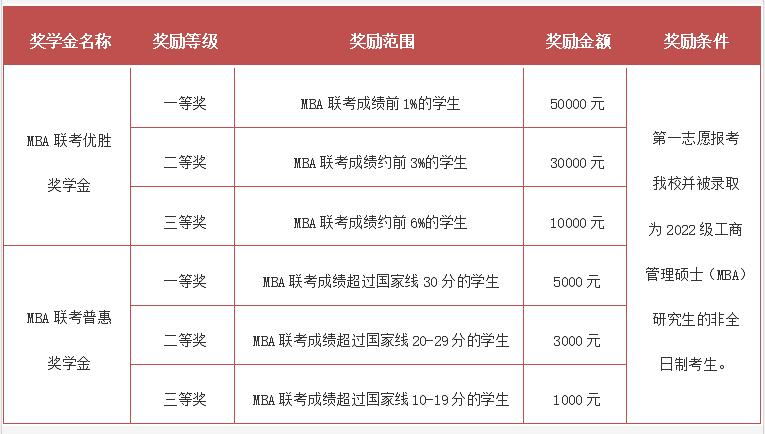 為了鼓勵優(yōu)秀人才攻讀非全日制工商管理碩士(MBA),培養(yǎng)更多品學兼優(yōu)的商界精英,北京交通大學MBA教育中心特設立MBA聯(lián)考優(yōu)勝獎學金、MBA聯(lián)考普惠獎學金。其獎勵范圍、獎金額度和獎勵對象如表二所示。2022級非全日制MBA新生獎學金評選辦法詳見后續(xù)通知。若有變動,均以具體通知為準。