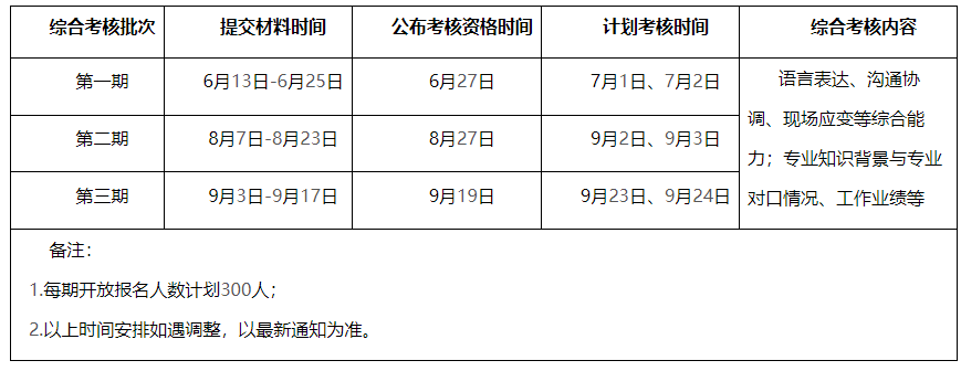 綜合考核分三期進(jìn)行,申請者僅可選擇其中一期參與。同時(shí)報(bào)名兩期或兩期以上的申請者,以前一期報(bào)名為有效報(bào)名,具體安排如下: