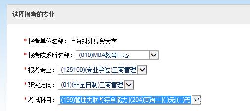 5、選擇報考專業(yè),請一定按以下信息填寫(研究方向)請按所報項目進行選擇,此處僅以在非全日制MBA為例: