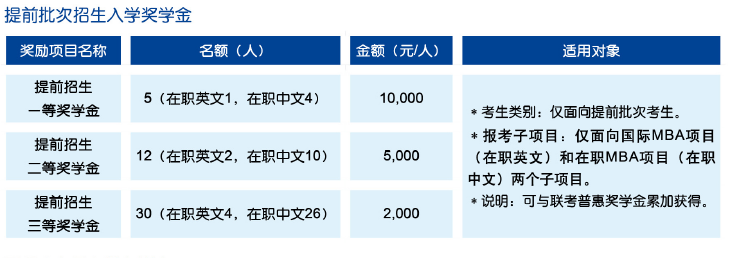 “MBA提前批次招生”將安排于2018年5月至11月底結(jié)束。對于準(zhǔn)備報(bào)考各個(gè)項(xiàng)目的考生,我們將從全部招生名額中安排較多比例的名額提供給提前批次招生批次的考生,以使優(yōu)秀的考生能選擇更優(yōu)先的渠道獲得錄取的機(jī)會。