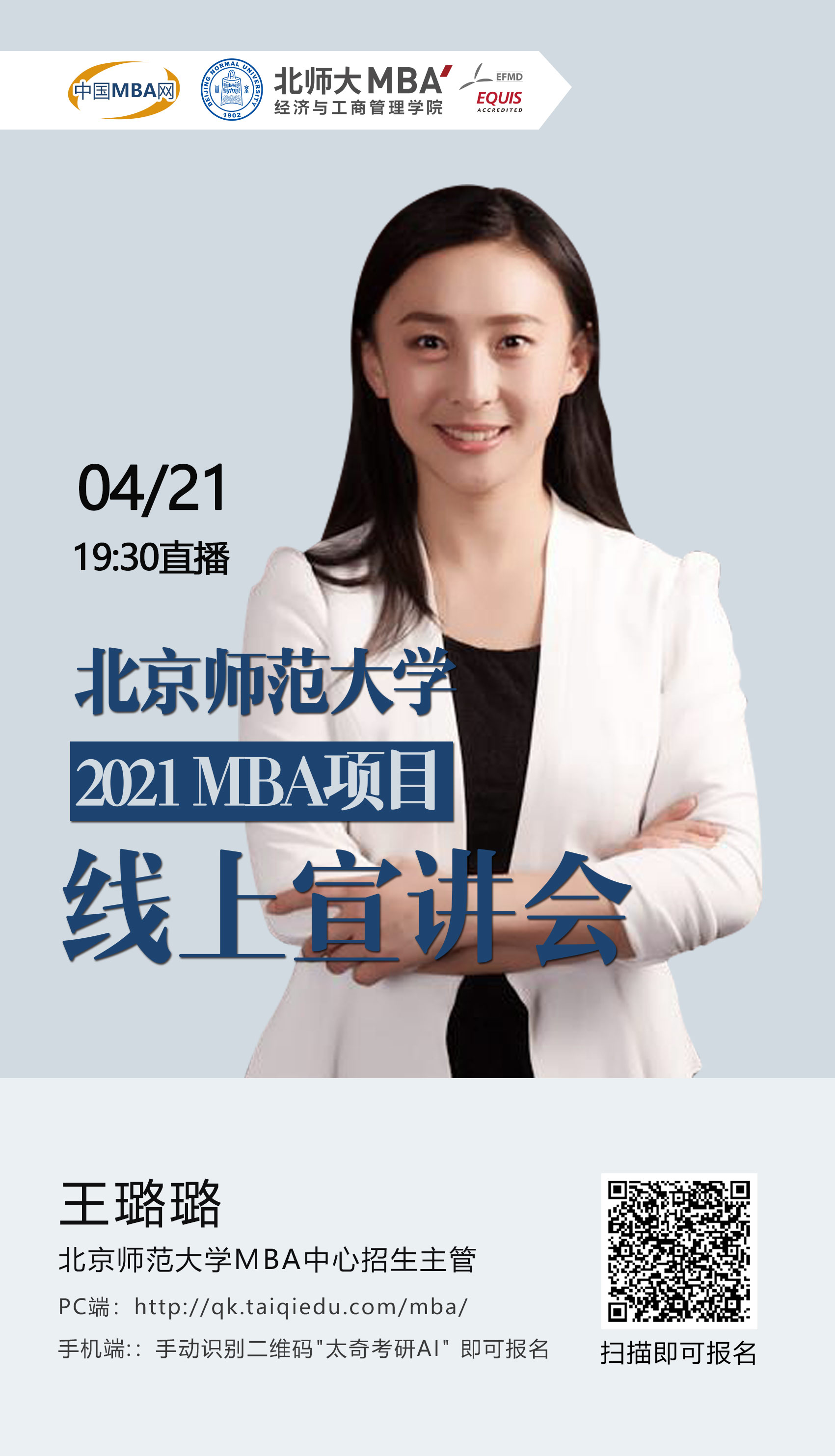 為了讓2021級(jí)考生能夠及時(shí)的了解我校2021年的招生政策及動(dòng)態(tài),北京師范大學(xué)MBA項(xiàng)目應(yīng)中國(guó)MBA網(wǎng)的邀請(qǐng)出席“2021全國(guó)商學(xué)院MBA/EMBA/MEM教育巡展暨招生政策發(fā)布會(huì)”.本次宣講會(huì)將以在線直播的形式為同學(xué)答疑解惑,歡迎廣大報(bào)考我校的同學(xué)積極報(bào)名參加,期待與你們線上直播互動(dòng)!