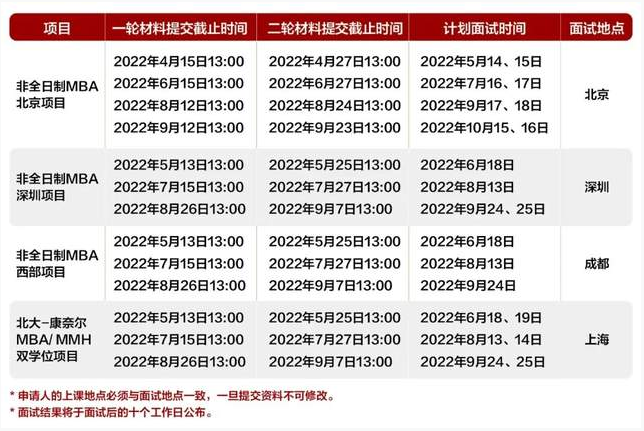 2023年非全日制MBA深圳、西部項(xiàng)目、北大-康奈爾MBA/MMH雙學(xué)位項(xiàng)目的一輪材料提交最終截止時(shí)間為2022年8月26日13:00,二輪材料提交最終截止時(shí)間為2022年9月7日13:00。