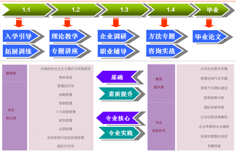 北方工業(yè)大學工商管理碩士(MBA)致力于培養(yǎng)注重方法與技能的應用型中高層管理人才。在培養(yǎng)過程中實行“通才教育 + 專長發(fā)展”的培養(yǎng)思路。切實幫助學員在兩年的MBA學習中實現(xiàn):思維范式轉換、知識體系更新、方法技能嫻熟、管理能力提升四個轉變,最終提升綜合管理勝任素質。