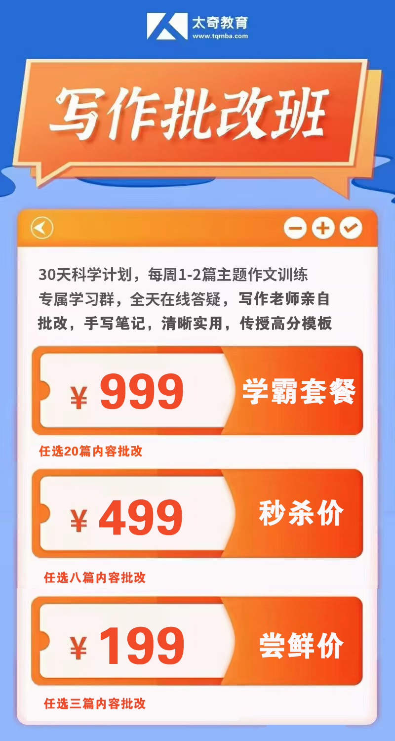 太奇寫作批改班也同步上線,為考生最大化模考收益,特聘請多位專業(yè)寫作老師判卷,1V1精講,需要的同學(xué)請咨詢太奇老師